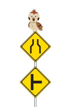 Aにいる太郎くんは「幅員減少」と「⊢形道路交差点あり」の標識が並んでいるのが「ハト」という字に見えたので、近くにいる鳥を鳩だと思いましたか?