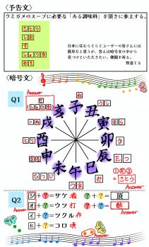 私はまだルールがよくわかっていないようです。Q1はさとう(砂糖)、Q2は酢でしょうから、予告文の枠内は味付けの基本と言われる「さとう、しお、す、しょうゆ、みそ」なのでしょうが、そこからどうやって答えを導き出すのかピンとこないのです