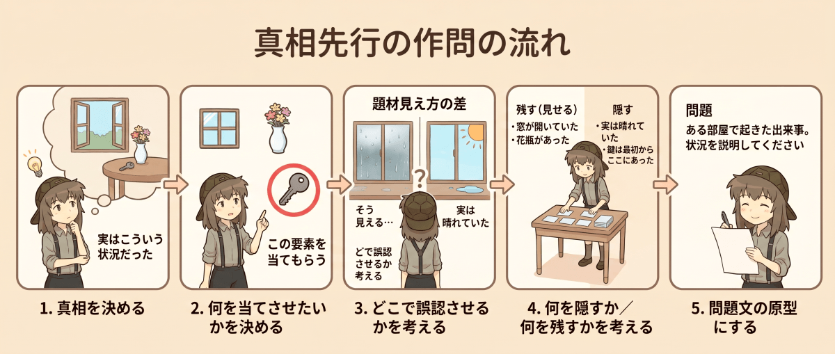 特に初心者におすすめしやすいのは、真相を先にある程度固めてから、そこに誤認を仕掛けて問題文にする流れです。